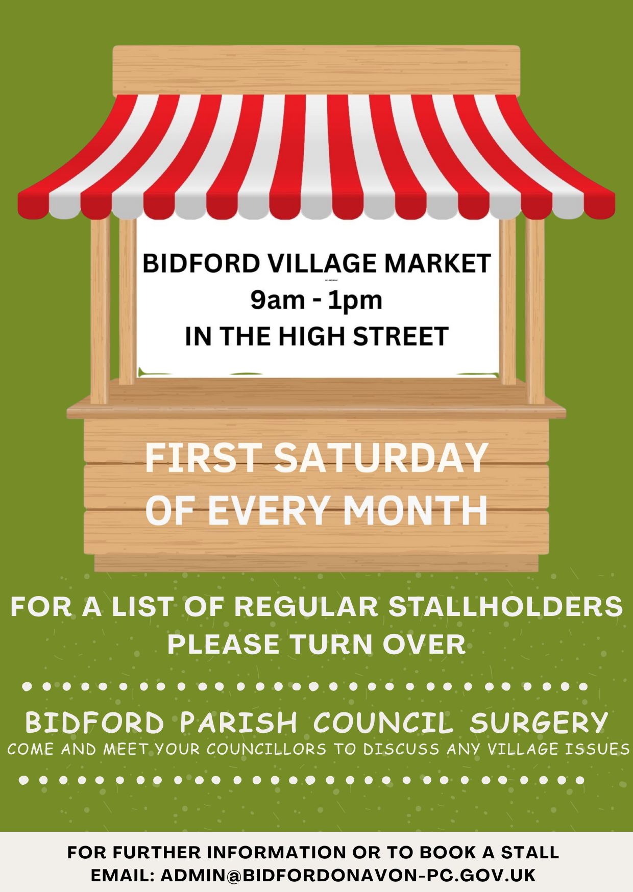 Bidford Village Market, 9am – 1pm in the High Street, first Saturday of every month. For further information or to book a stall, email...