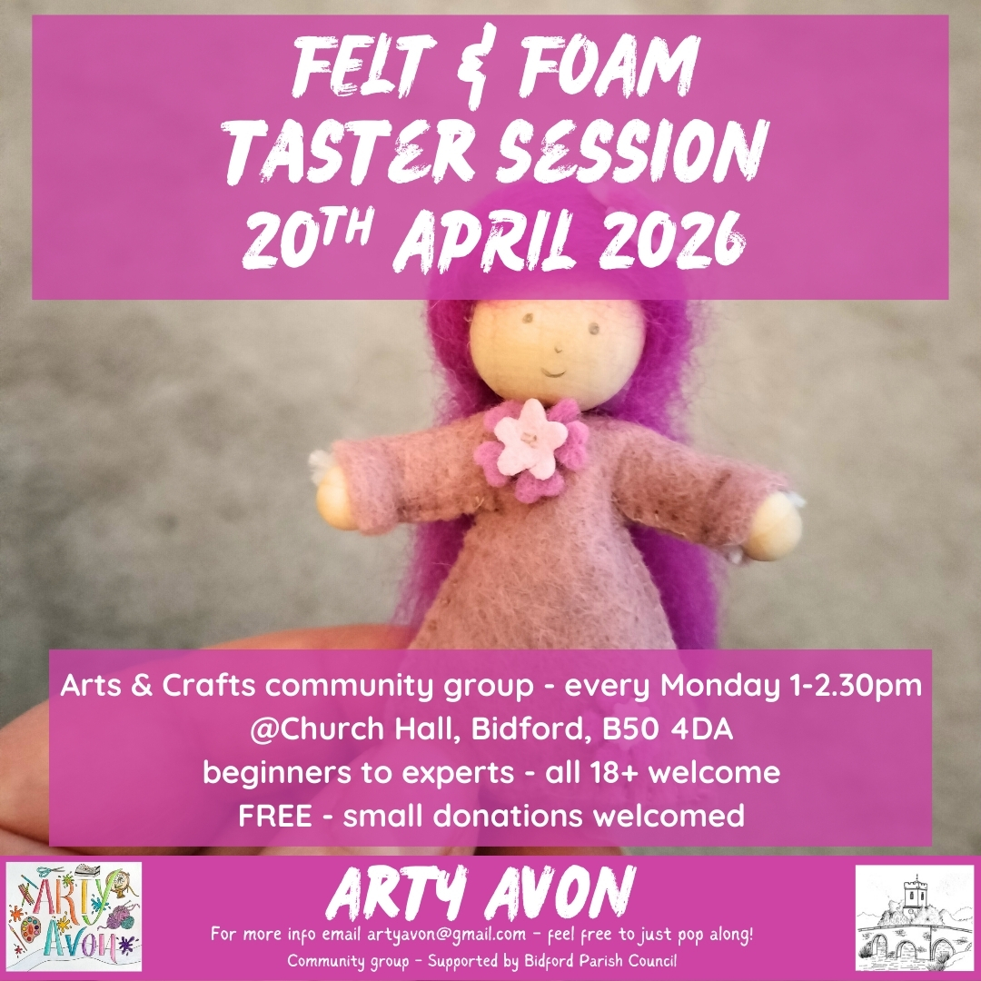 Join Arty Avon for a felt & foam taster session on Monday 20th April, 1-2.30pm at Church Hall, Bidford. Beginners to experts, all 18+...