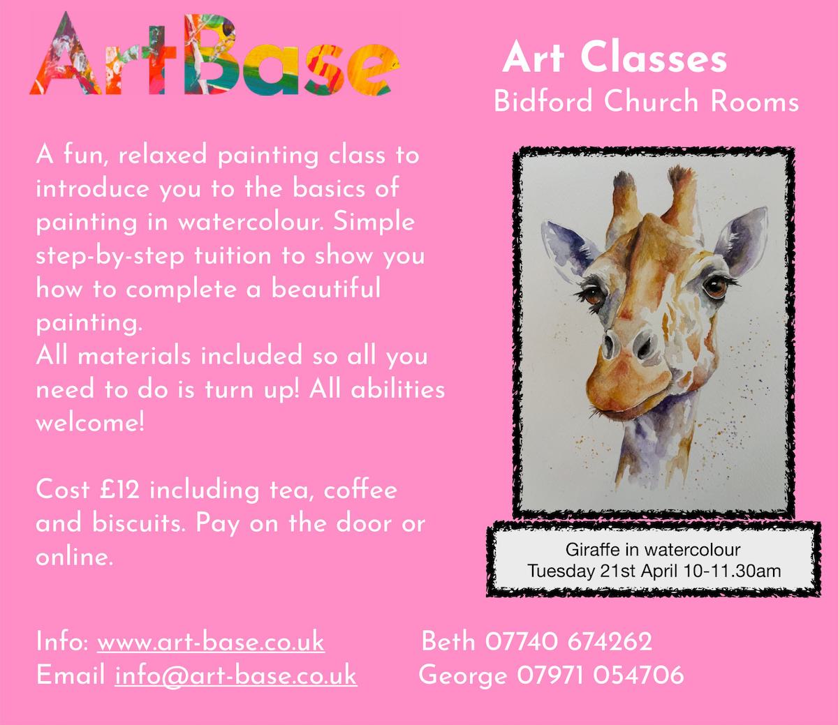 Join ArtBase on Tuesday 21st April 10-11.30am at Church Hall, Bidford, and learn how to paint a giraffe in watercolour. All materials are...