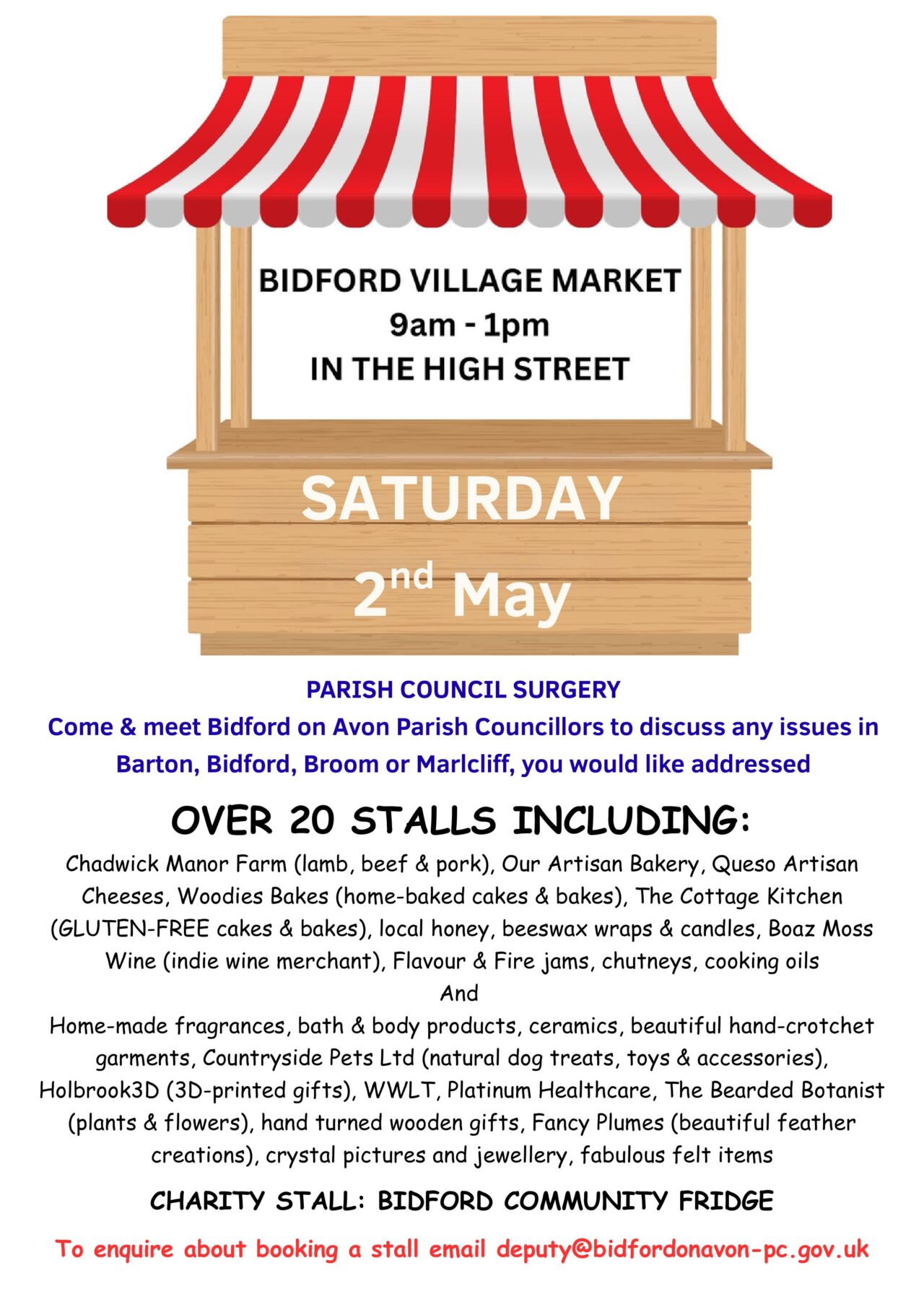 Over 20 stalls, plus the Parish Council will be holding a surgery – come and discuss any issues in Bidford, Barton, Broom or Marlcliff.