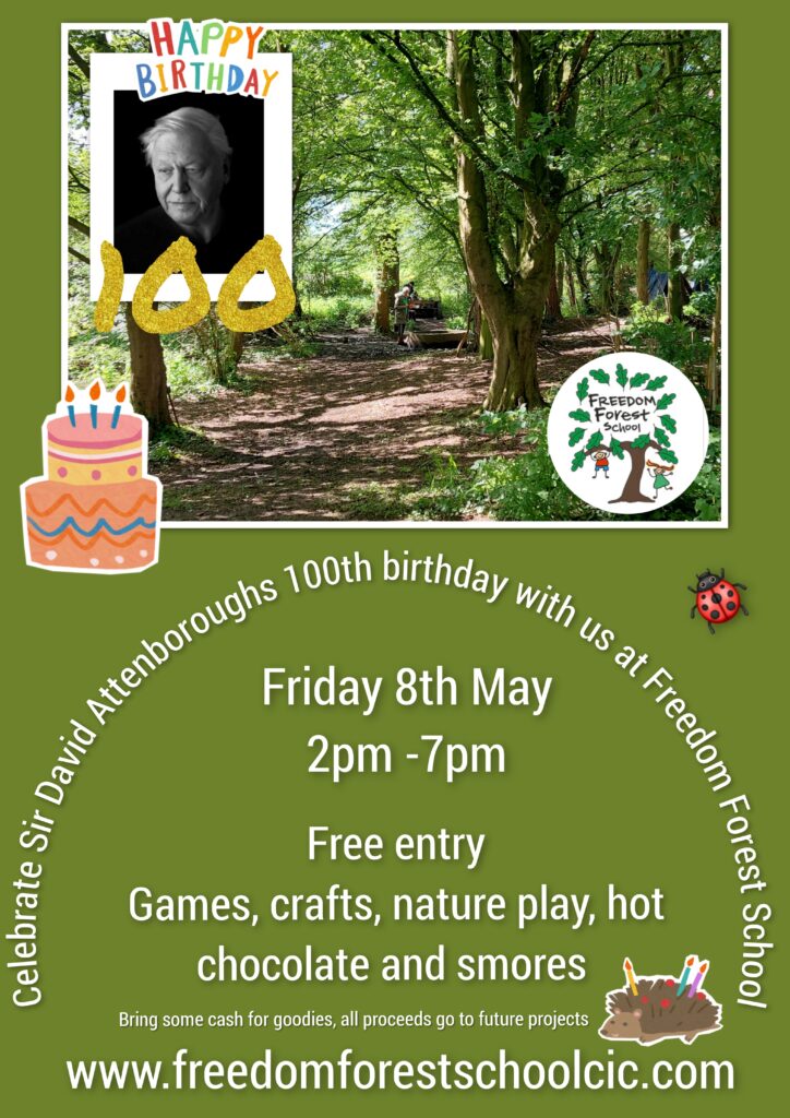 Celebrate Sir David Attenborough’s 100th birthday with Freedom Forest School, Friday 8th May 2pm-7pm.