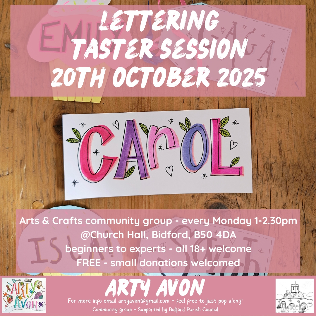 Join Arty Avon for a lettering taster session on Monday 20th October, 1-2.30pm at Church Hall, Bidford. Beginners to experts, all 18+ welcome....