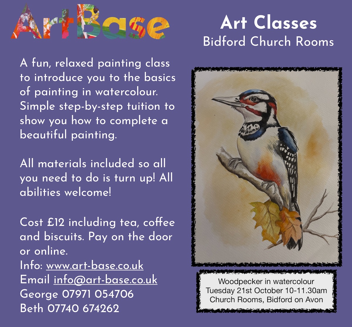 Join ArtBase on Tuesday 21st October 10-11.30am at Church Hall, Bidford, and learn how to paint a woodpecker in watercolour. All materials are...