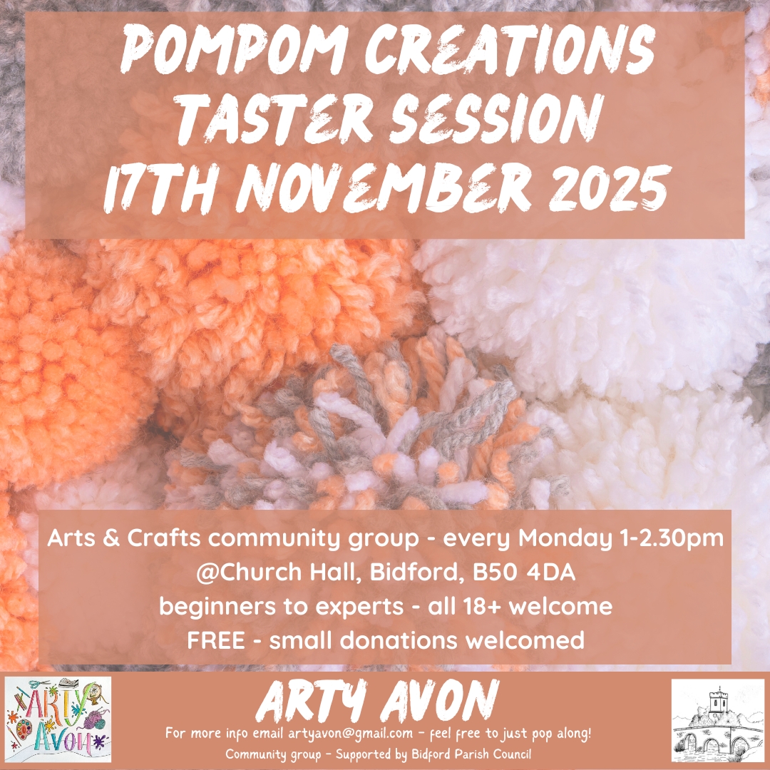 Join Arty Avon for a pompom creations taster session on Monday 17th November, 1-2.30pm at Church Hall, Bidford. Beginners to experts, all 18+ welcome. This is a free session (small donations welcomed). For more info email artyavon@gmail.com