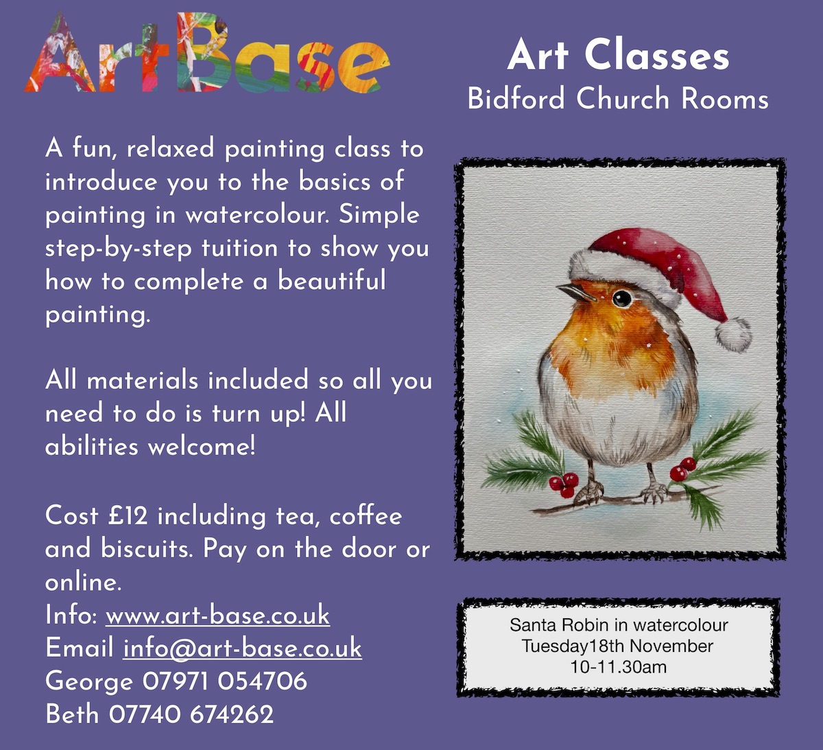 Join ArtBase on Tuesday 18th November 10-11.30am at Church Hall, Bidford, and learn how to paint a Santa robin in watercolour. All materials are provided, you just need to turn up! All abilities welcome! Cost £12 including tea, coffee and biscuits. Pay on the door or online at www.art-base.co.uk For more info email info@art-base.co.uk