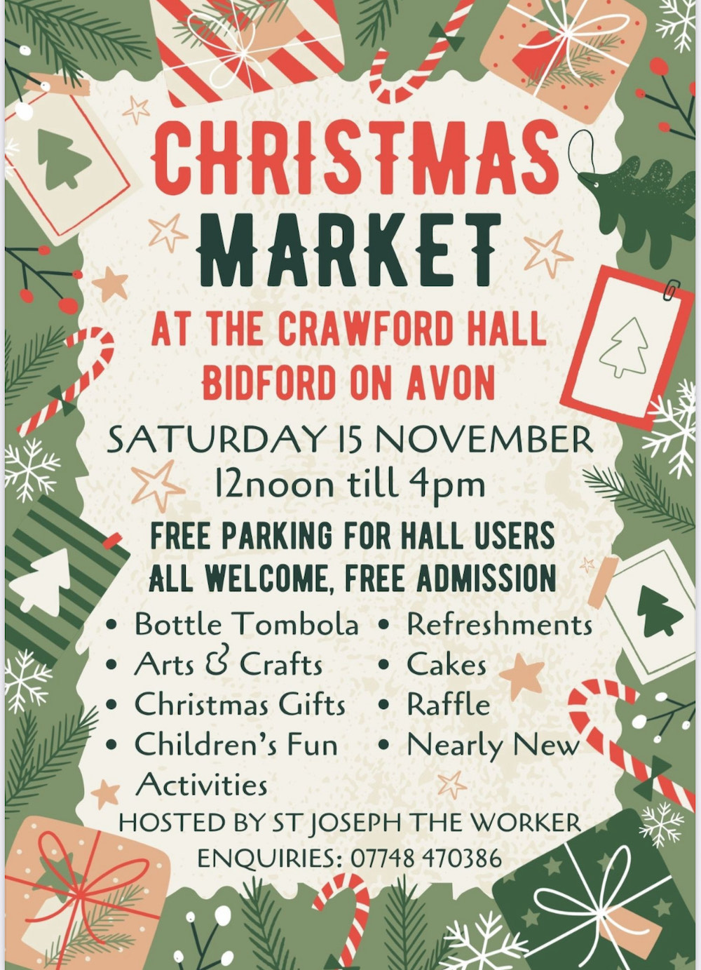 Christmas market at the Crawford Hall, Saturday 15th November 12-4pm. Free parking for hall users. All welcome, free admission. For enquiries call 07748 470386.