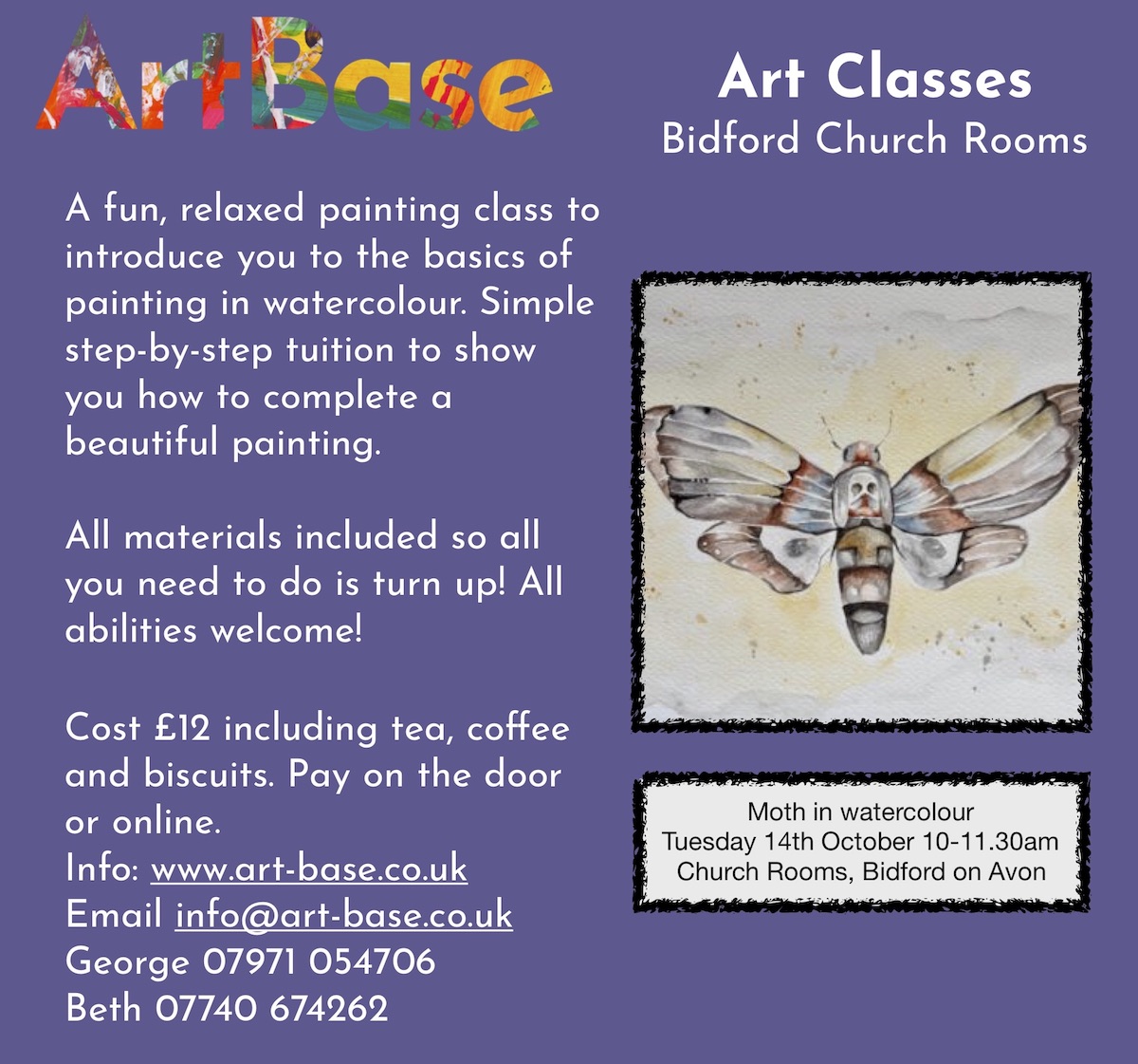 Join ArtBase on Tuesday 14th October 10-11.30am at Church Hall, Bidford, and learn how to paint a moth in watercolour. All materials are...